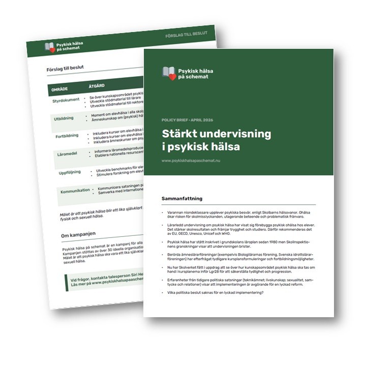- Läroplanen för grundskolan år 2028. Skolverket har fått i uppdrag att föreslå nya kursplaner för grundskolan till hösten 2028. I regeringens uppdragsbeskrivning står: ”I arbetet med kursplanerna ska Skolverket överväga hur (…) kunskaper om psykisk hälsa ska tas om hand i kursplanerna i de ämnen där det är relevant.” (sid. 99)